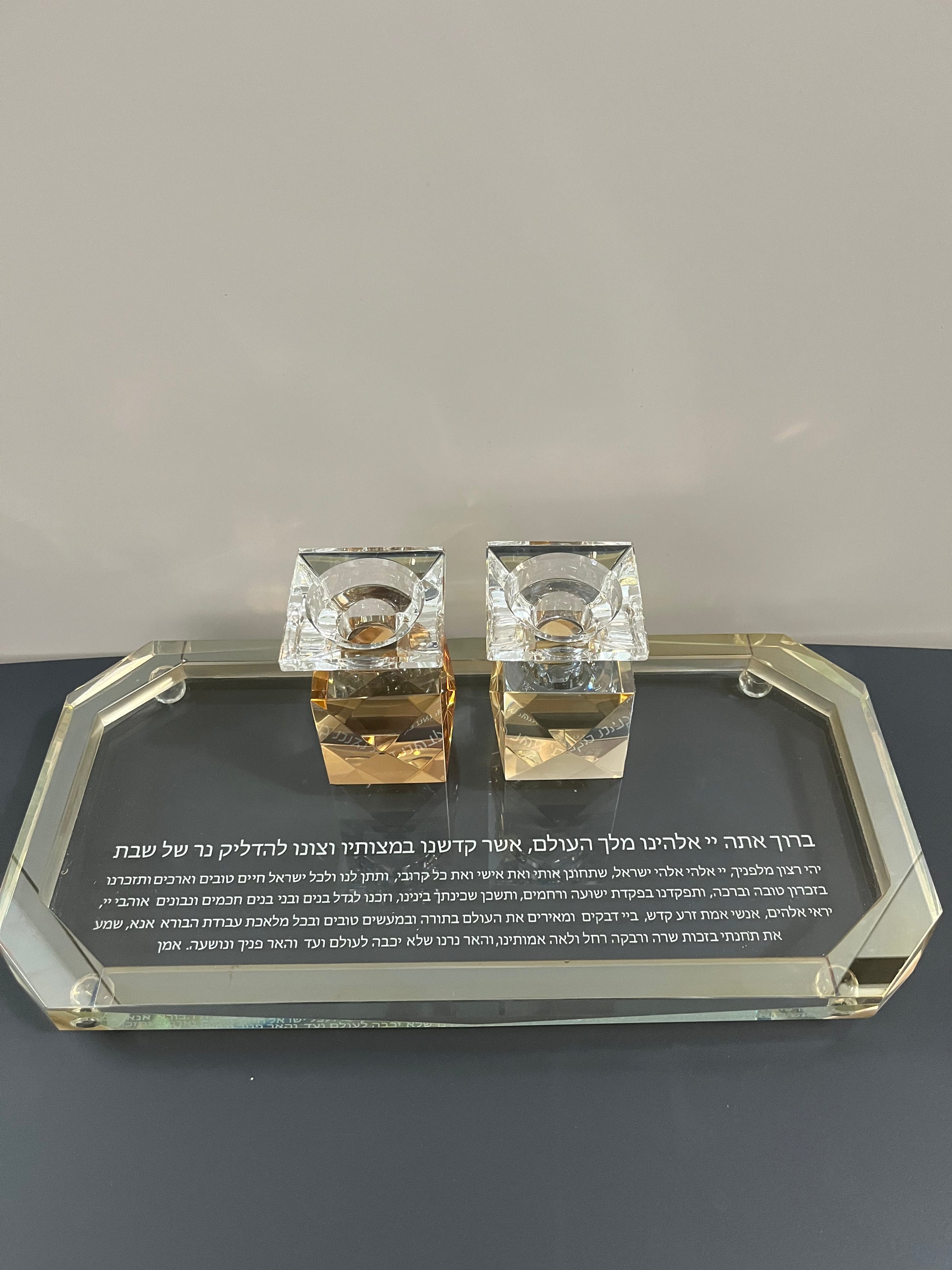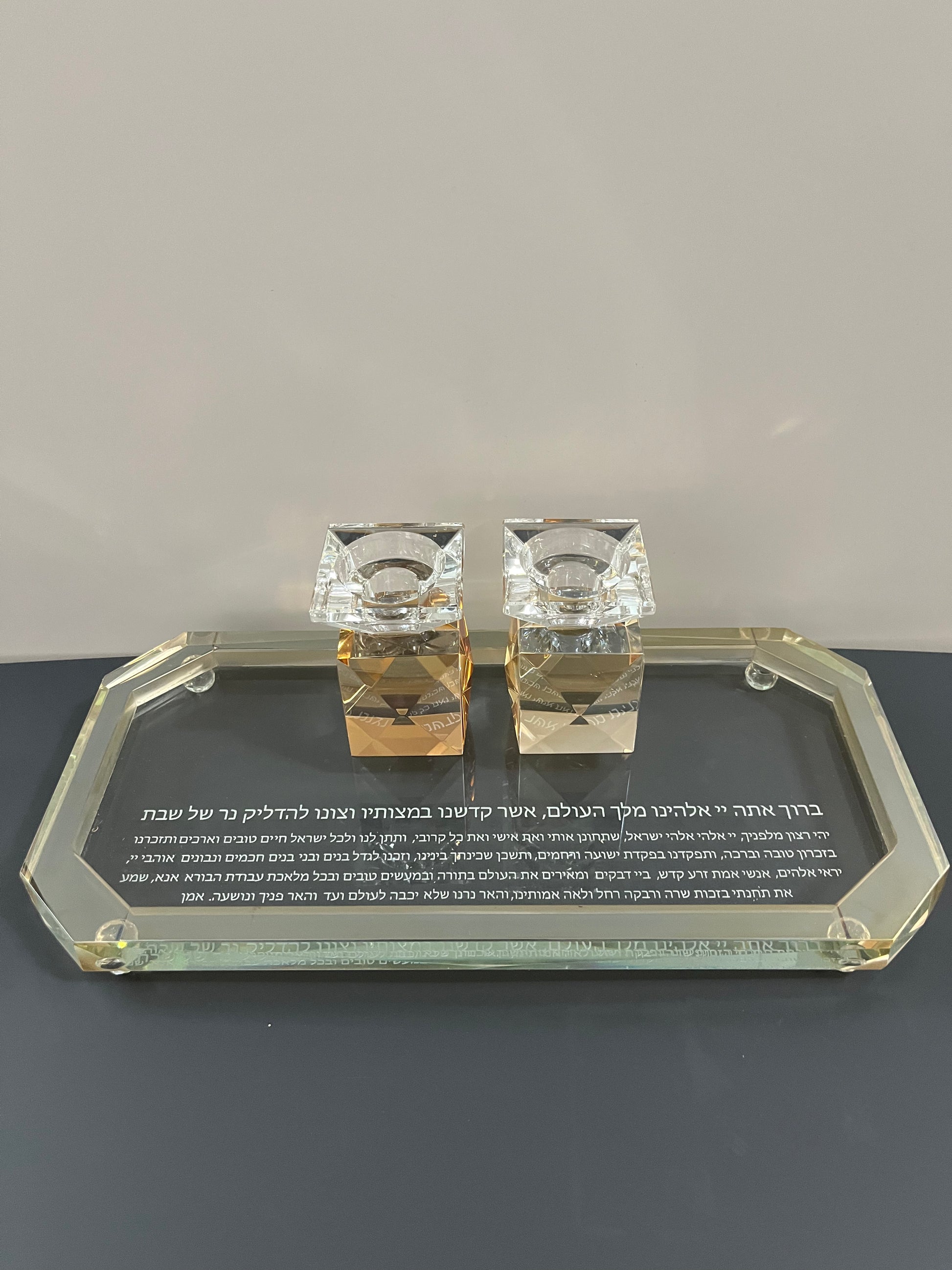 סט פמוטים יוקרתי מקריסטל איכותי עם מגש ברכת הדלקת נרות בגודל 35 ס"מ. מוסיף אור, יוקרה וחוויה לשולחן השבת.