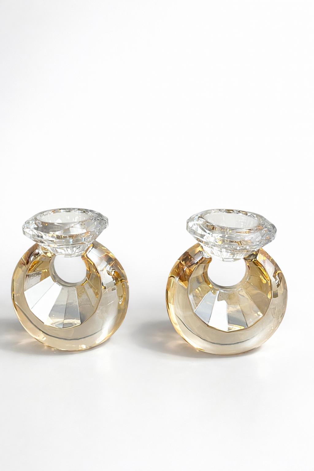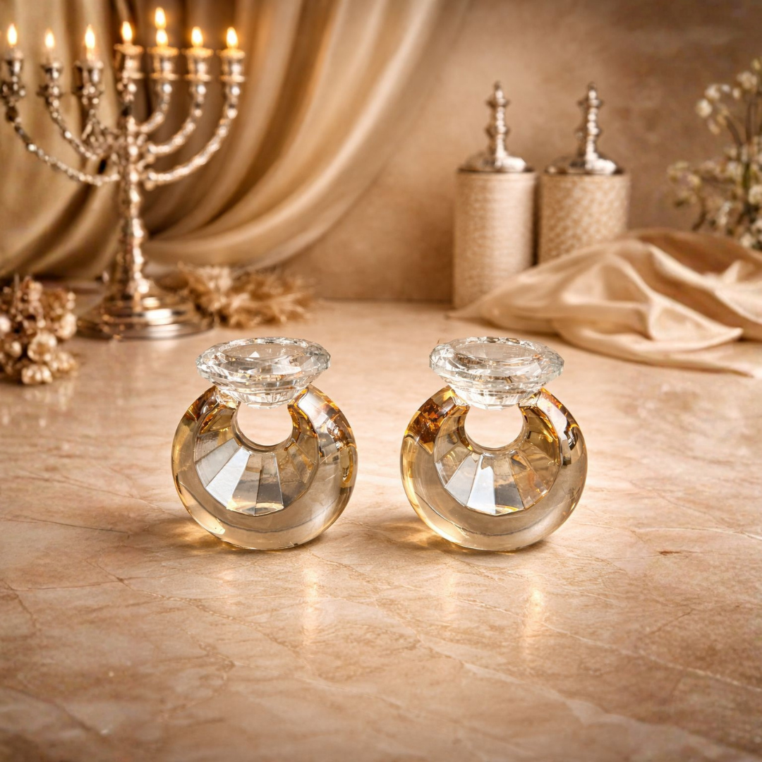 פמוטים יוקרתיים מקריסטל בעיצוב טבעת יהלום מרשים, המשלבים זוהר, אלגנטיות וקדושה לשבת. מעניקים לשולחן מראה חגיגי ומיוחד