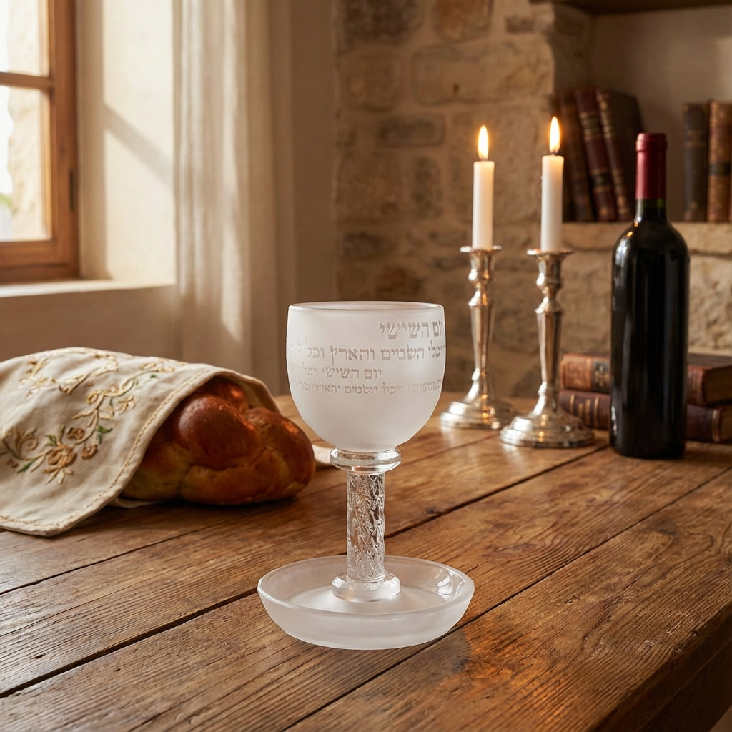 כוס קידוש אלגנטית מקרסיטל בגימור חלבי עדין עם כיתוב “יום השישי".
