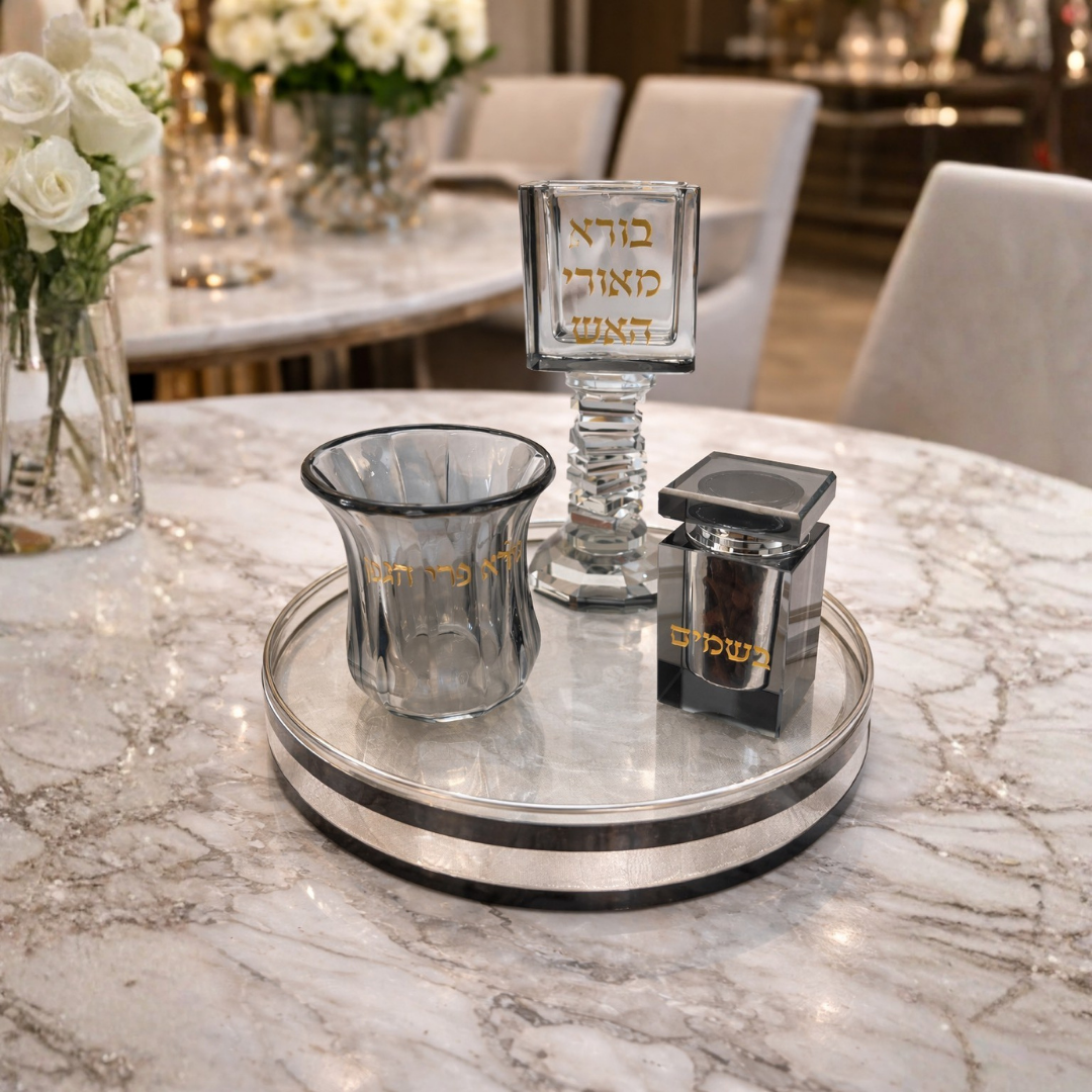 סט הבדלה עם מגש מסתובב- כוס קידוש מעמד לנר ובשמים שמקנים רגעים של יוקרה וייחודיות.