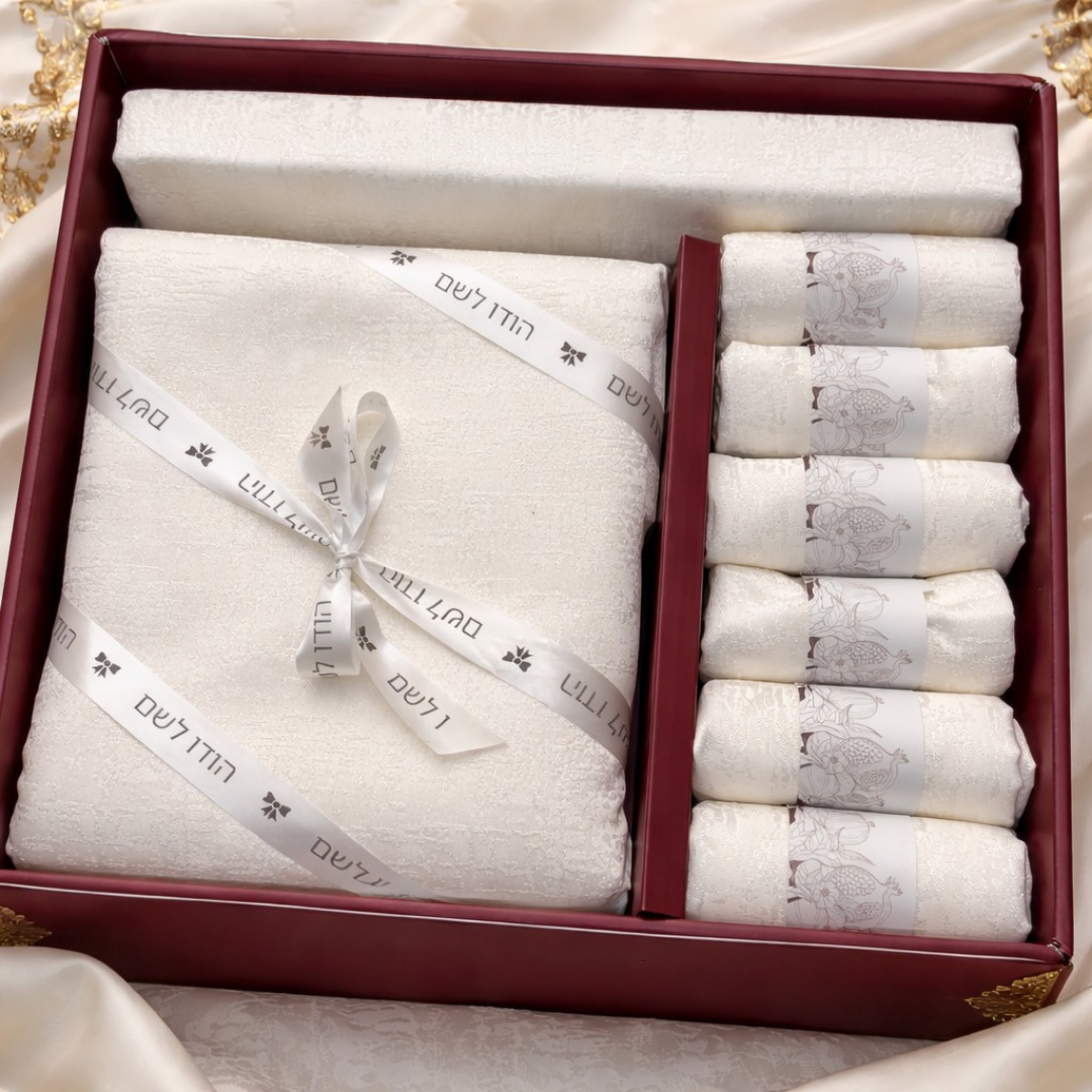 מפה, 6 מפיות וראנר מבד איכותי ועיצוב קלאסי ומודרני לחוויית שבת מיוחדת.