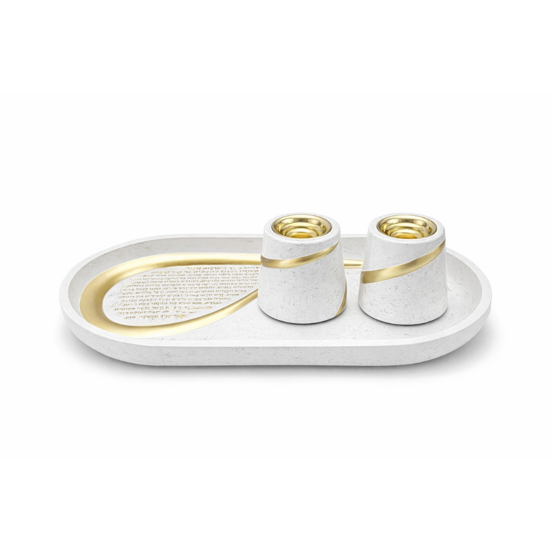 סט פמוטים יוקרתי המגיע עם מגש ברכת ״הדלקת נרות״ מעוצב בגודל של 35 ס"מ, המוסיף סטייל ואור לשולחן השבת. שילוב מושלם בין מסורת, איכות ועיצוב מרשים.